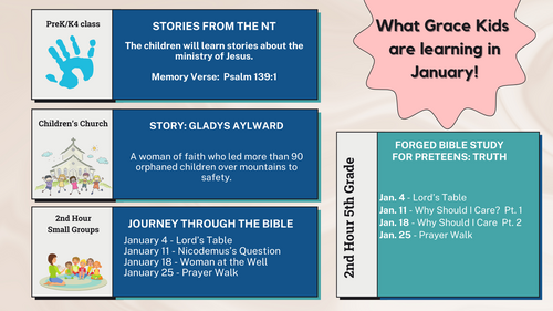 January brings a church focus on prayer. Children can use the 21 Day Prayer Guide provided at the Grace Kids Welcome Desk.