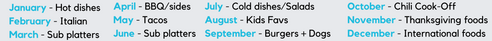 Each month brings a different meal that everyone contributes to potluck style!