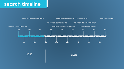As a result, we established the Pastoral Search Committee made up of elders and representatives from the church Body. This committee has been tasked with meeting to establish and execute the pastoral search process. This is a process that is individualized to every church that walks through it, and we want to be very intentional with how we need to walk through it to best serve our congregation.