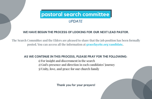The pastoral search committee would like to share that the job opening for our next lead pastor has been formally posted and is accepting applications. Please follow this link for more detailed info or to share this opportunity with a potential candidate: https://gracefayette.org/candidate