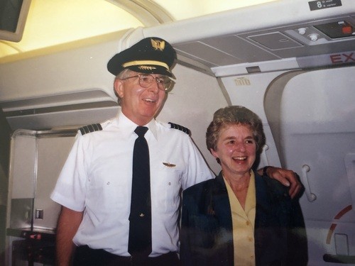 Dick + Clare inside an airplane Dick piloted.